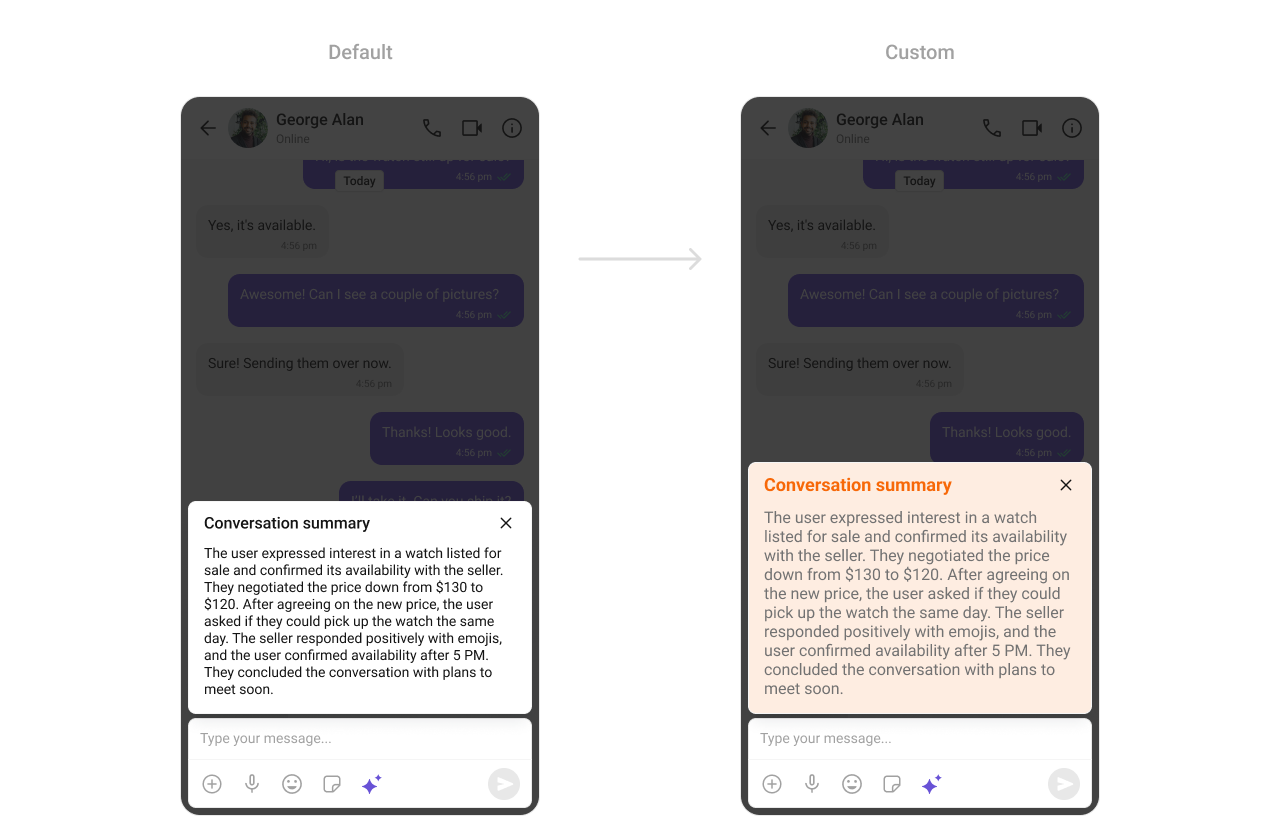 TheCometChatConversationSummary Component highlights the essence of a conversation, including participant details, last message, and timestamp. Customize text sizes, colors, and spacing to create visually distinct summaries that improve readability and engagement.