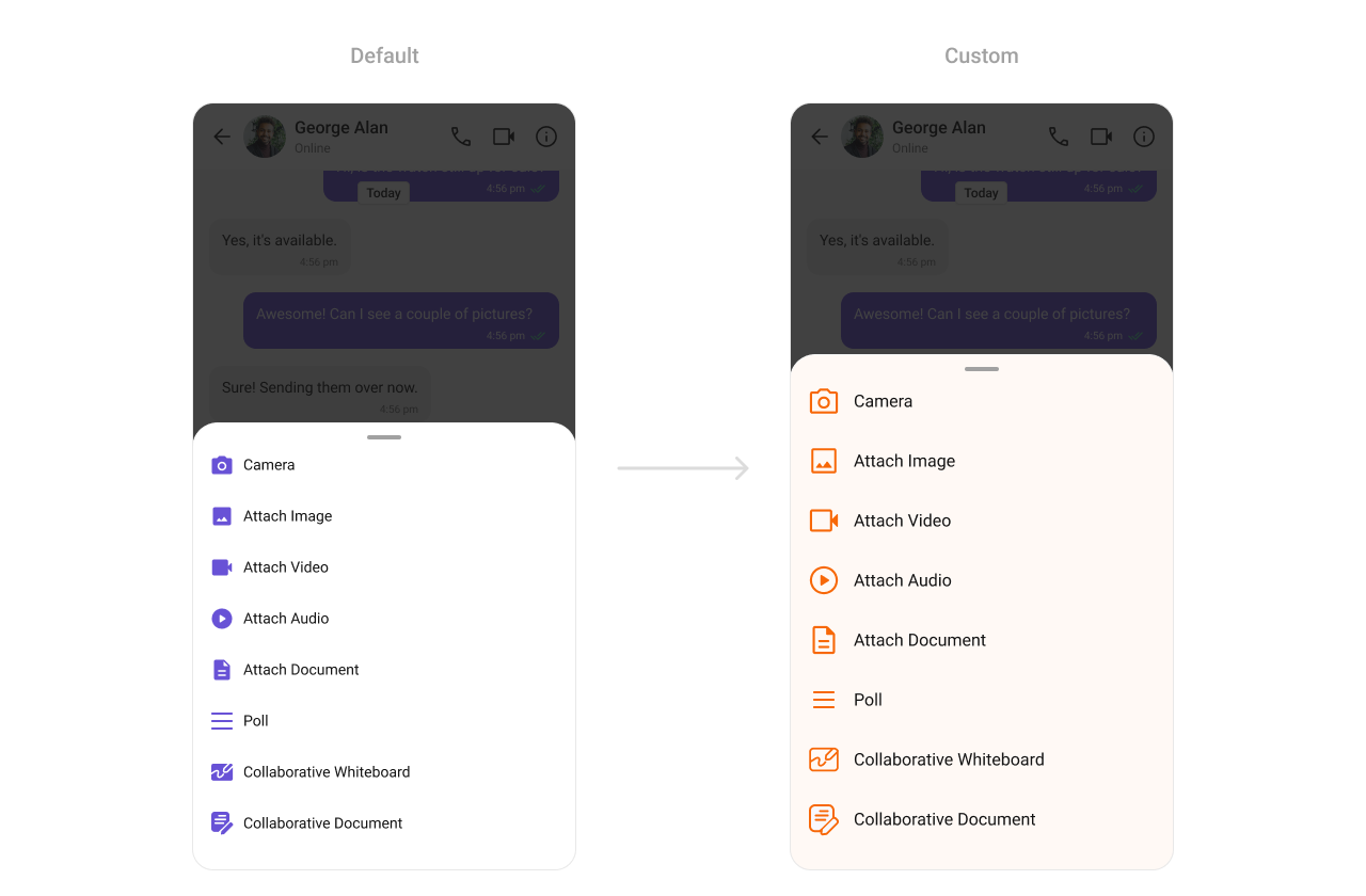 TheCometChatAttachmentOptionSheet Component provides a sleek interface for users to attach media, documents, or other files. It supports icon and text customizations to create a cohesive attachment experience.