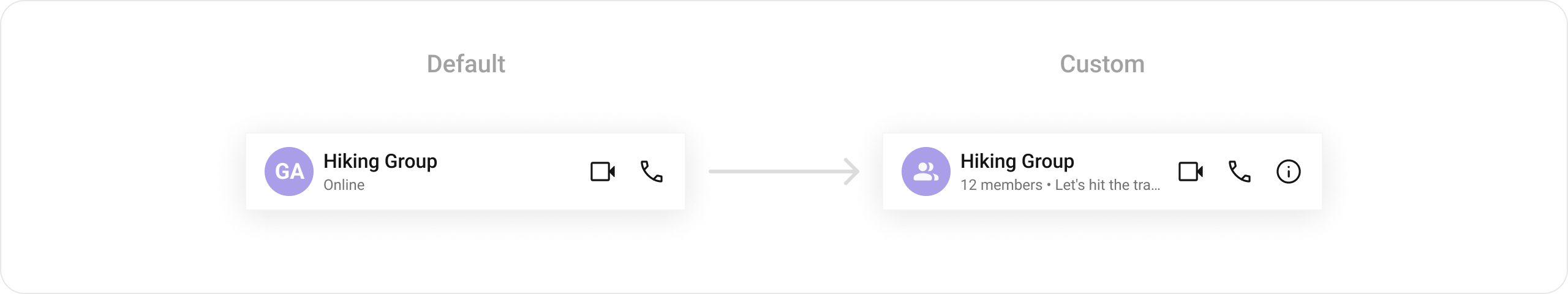 trailingViewList<Widget>? Function(User? user, Group? group, BuildContext context)?Set appbar options for the trailing view.