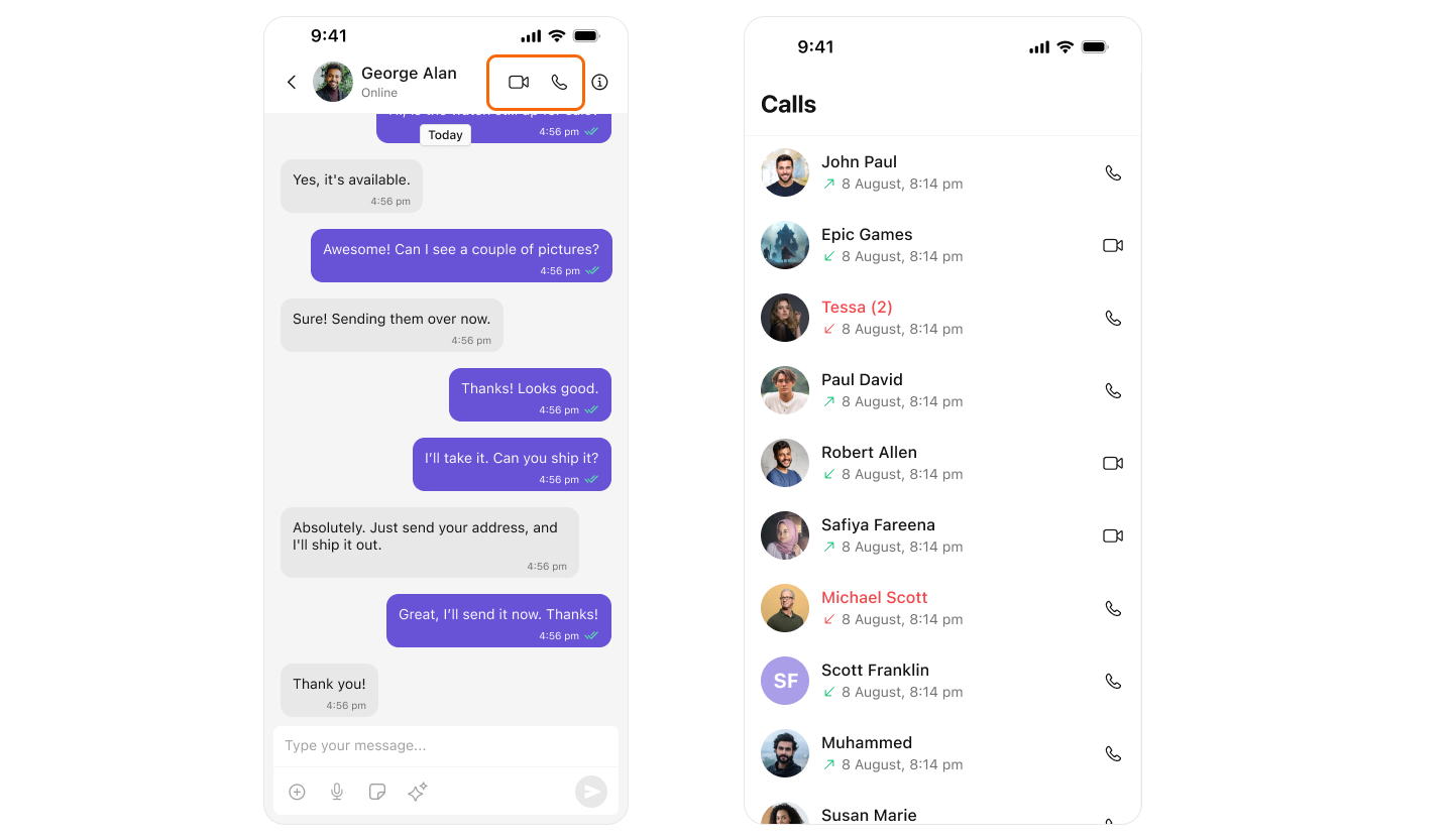 Add one-on-one and group audio/video calling to your iOS app. Once integrated, call buttons automatically appear in chat headers, and incoming/outgoing call screens are handled for you.