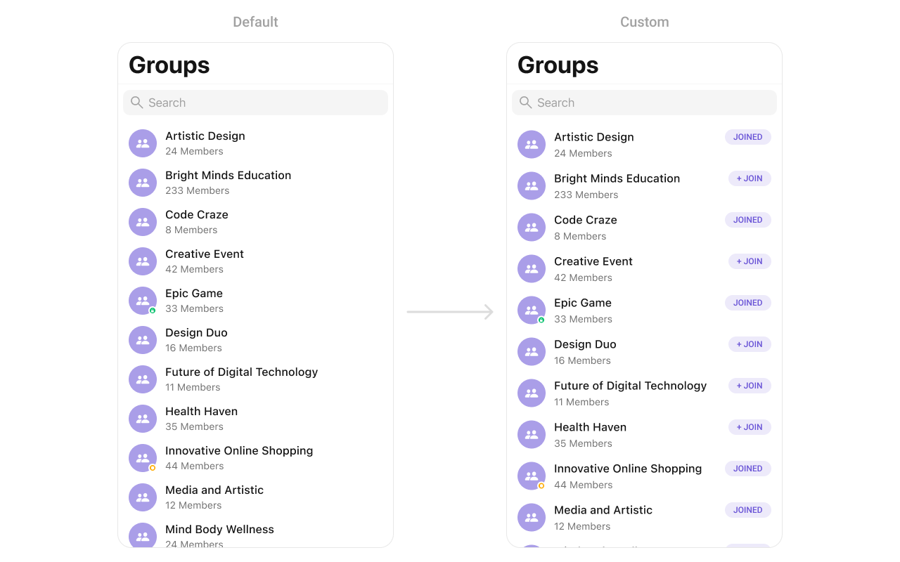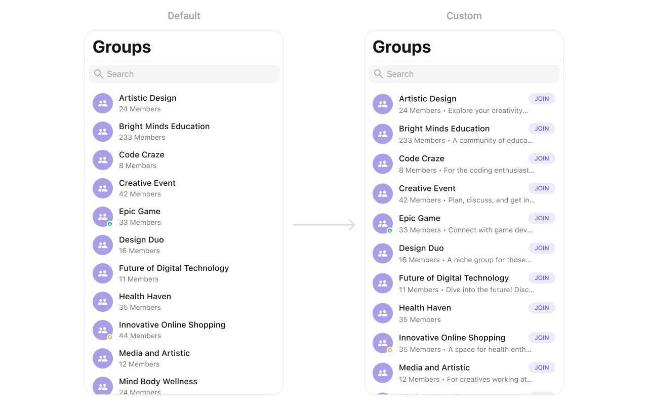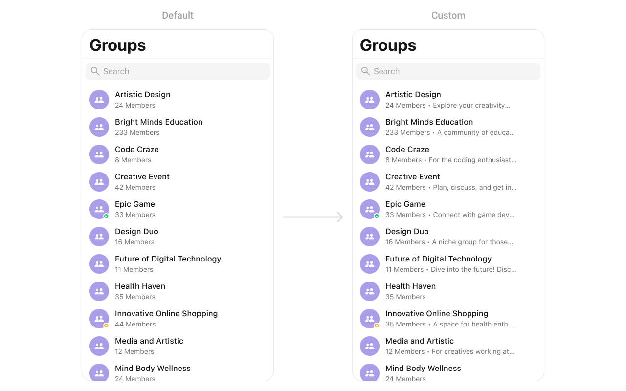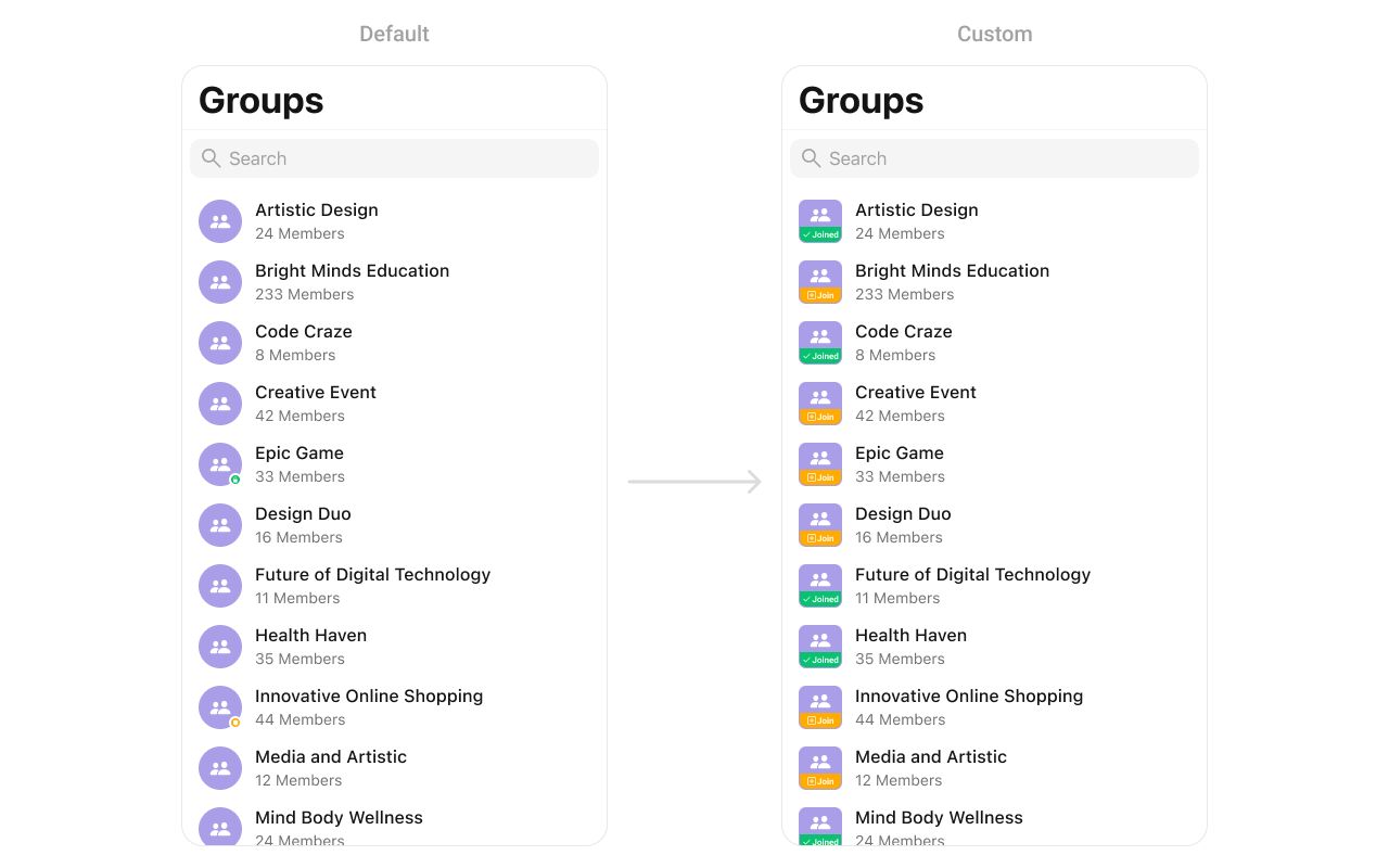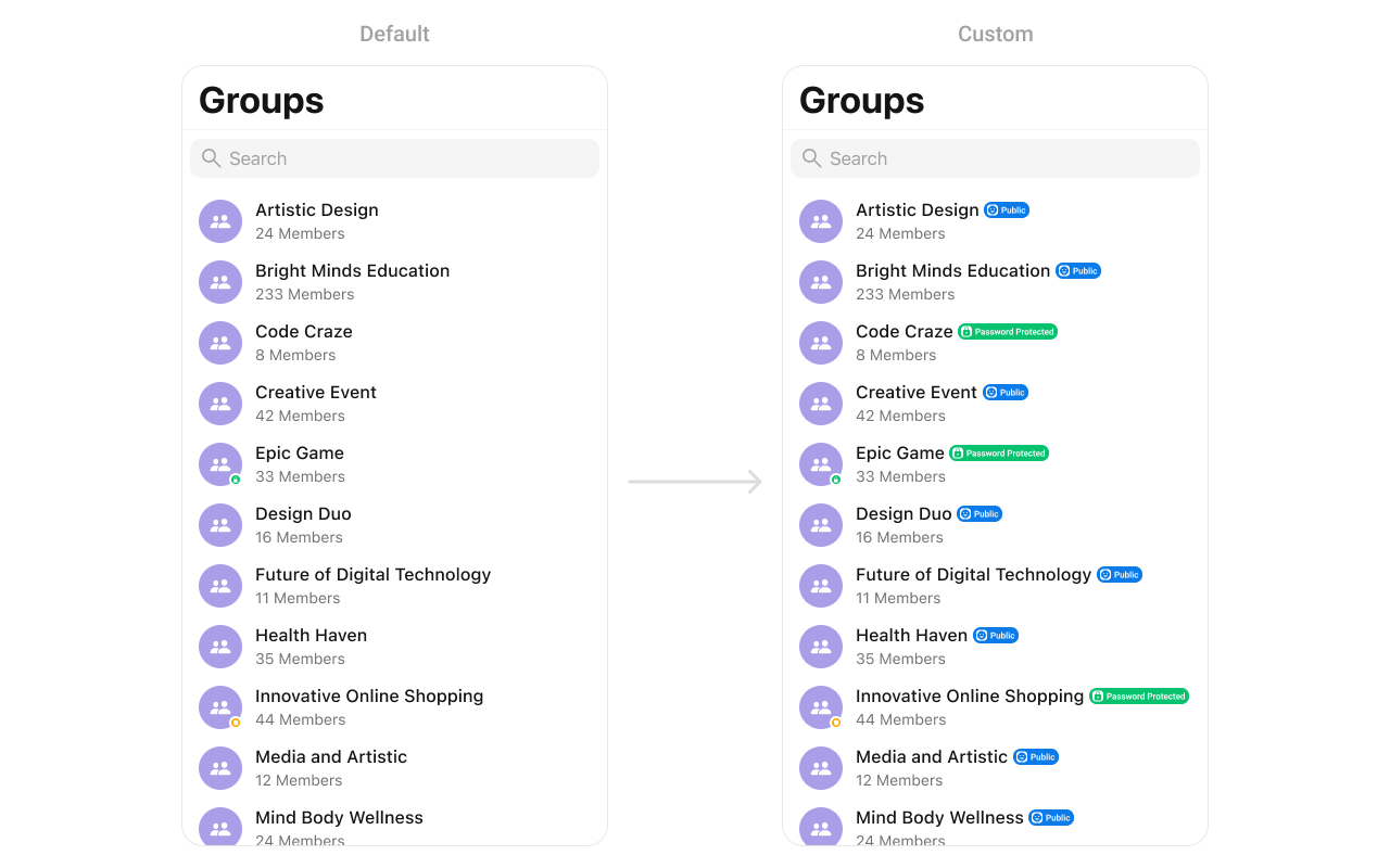 | Group type badges | Style | privateGroupBadgeColor | Custom badge colors |