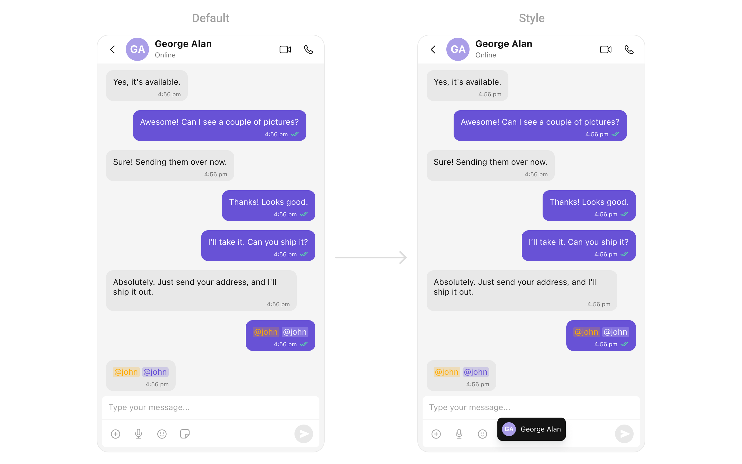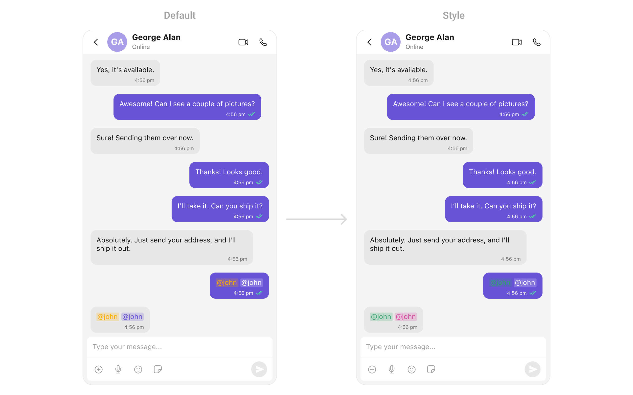 | Set composerTextStyle | Sets styling for composer’s formatted text | MentionTextStyle |