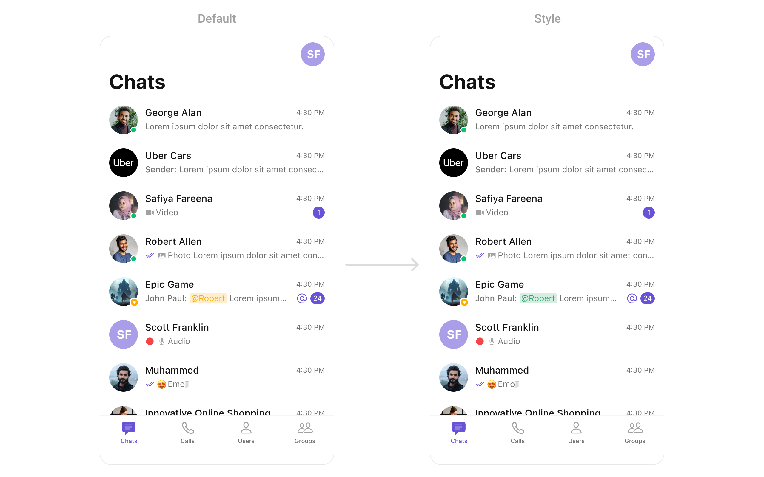 .set(leftBubbleTextStyle),.set(rightBubbleTextStyle),.set(composerTextStyle), and.set(conversationListTextStyle)methods to format text messages with mentions appropriately for display in the chat interface. - Customization: Customize the appearance and behavior of mentions by adjusting the text styles, colors, and other formatting properties as needed.