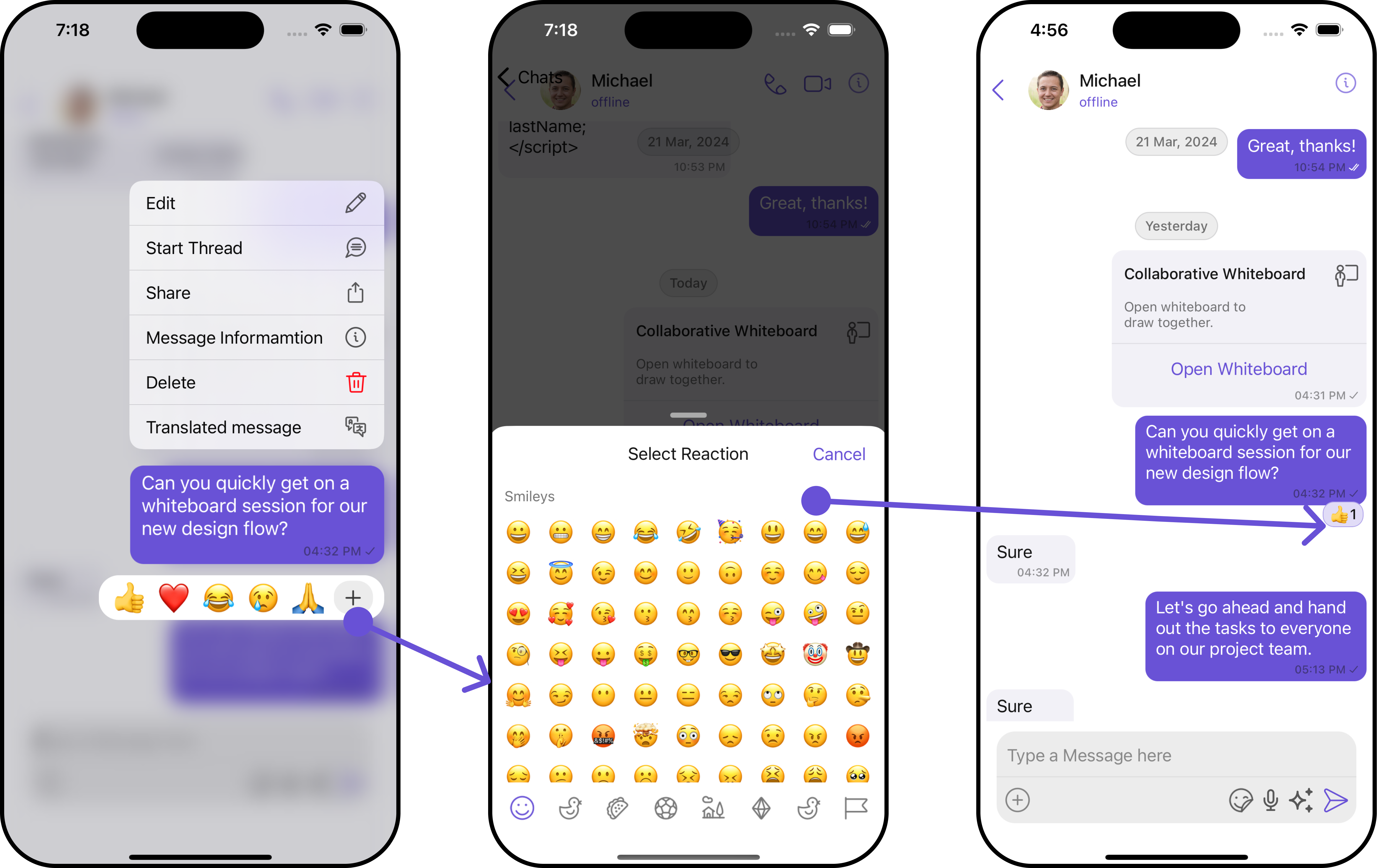 Message Reactions extension lets users express their emotions towards a message by choosing from a range of emojis. It provides a quick way to respond to any shared message. For a comprehensive understanding and guide on implementing and using the Message Reactions Extension, refer to our specific guide on the Message Reactions Extension. Once you have successfully activated the Message Reactions Extension from your CometChat Dashboard, the feature will automatically be incorporated into the Action Sheet of MessageList Component component of UI Kits.