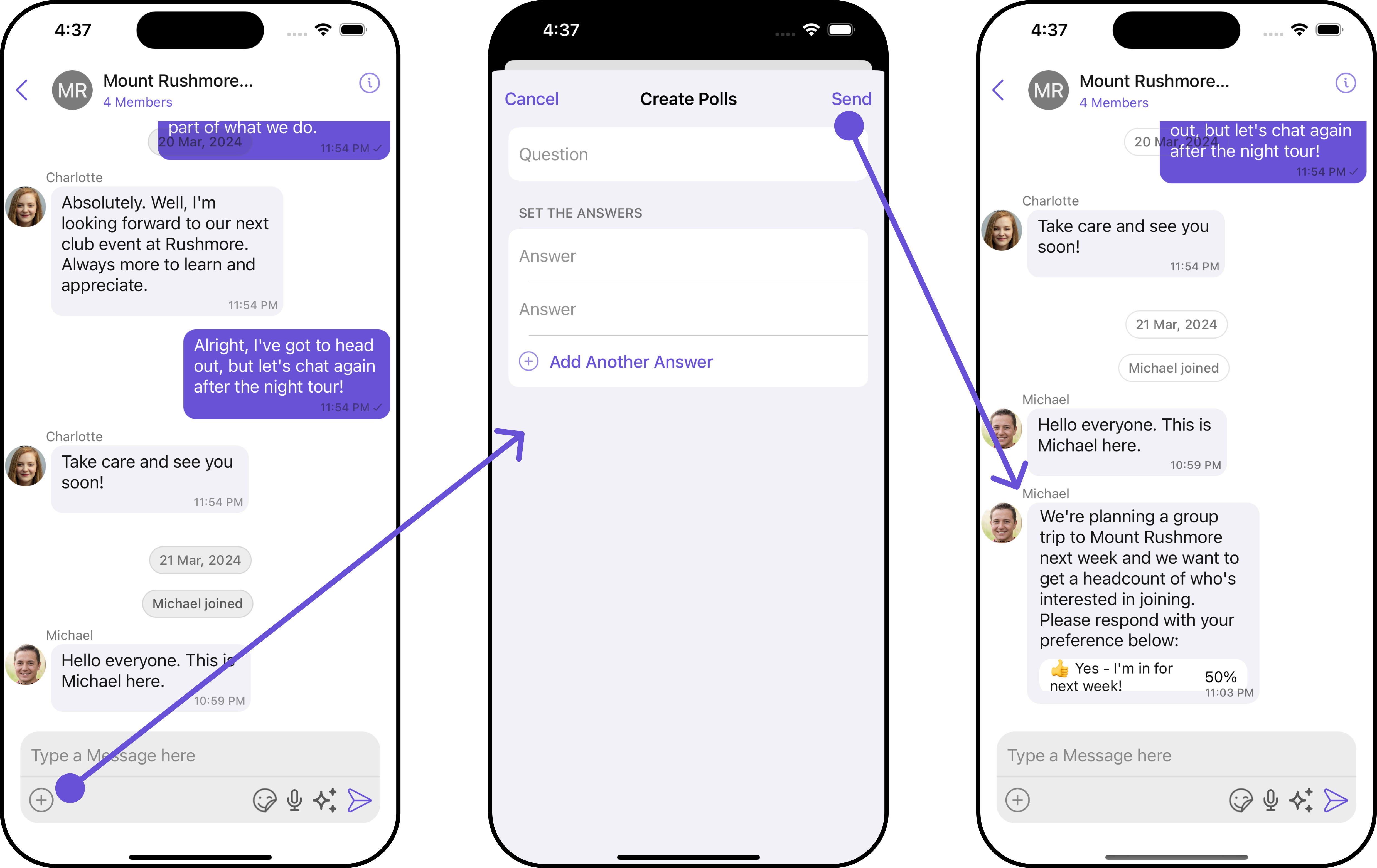 The Polls extension enhances group discussions by allowing users to create polls. Users can ask questions with a predefined list of answers, enabling a quick, organized way to gather group opinions. For a comprehensive understanding and guide on implementing and using the Polls Extension, refer to our specific guide on the Polls Extension. Once you have successfully activated the Polls Extension from your CometChat Dashboard, the feature will automatically be incorporated into the Action Sheet of the Message Composer component of UI Kits.