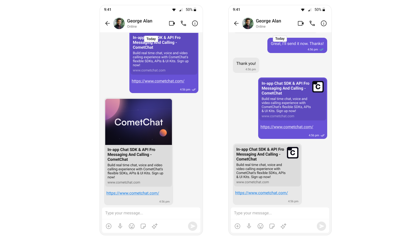The Link Preview extension provides a summary of the URL shared in the chat. It includes the title, a description, and a thumbnail image from the web page. For a comprehensive understanding and guide on implementing and using the Link Preview Extension, refer to our specific guide on the Link Preview Extension. Once you have successfully activated the Link Preview Extension from your CometChat Dashboard, the feature will automatically be incorporated into the Message Bubble of MessageList Component component of UI Kits.