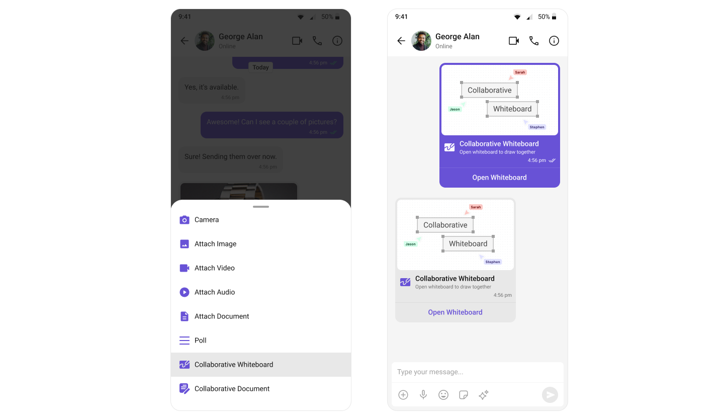 The Collaborative Whiteboard extension facilitates real-time collaboration. Users can draw, brainstorm, and share ideas on a shared digital whiteboard. For a comprehensive understanding and guide on implementing and using the Collaborative Whiteboard Extension, refer to our specific guide on the Collaborative Whiteboard Extension. Once you have successfully activated the Collaborative Whiteboard Extension from your CometChat Dashboard, the feature will automatically be incorporated into the Action Sheet of the Message Composer component of UI Kits.