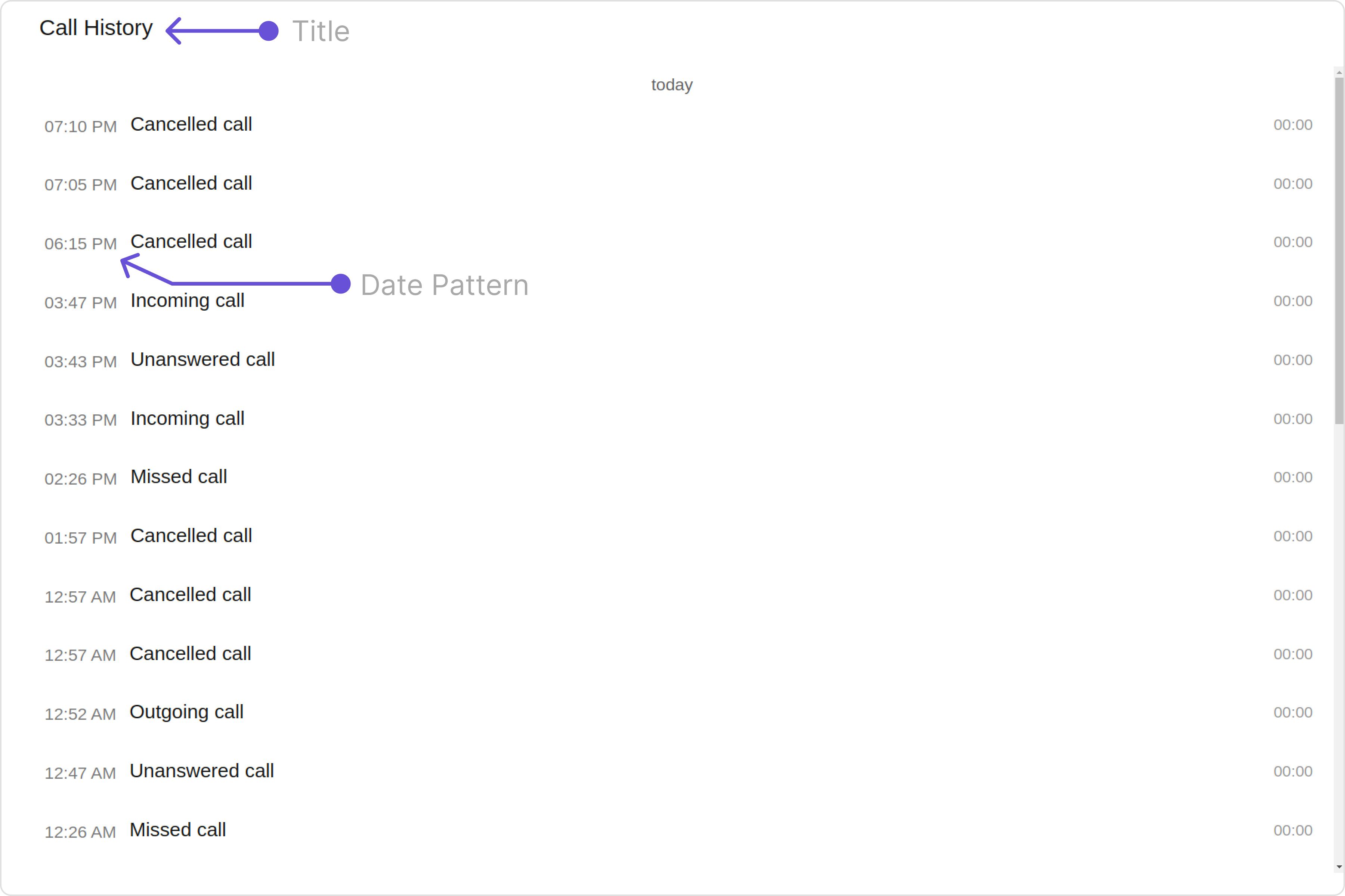 To fit your app’s design requirements, you have the ability to customize the appearance of theCallLogHistory component. We provide exposed methods that allow you to modify the experience and behavior according to your specific needs.
