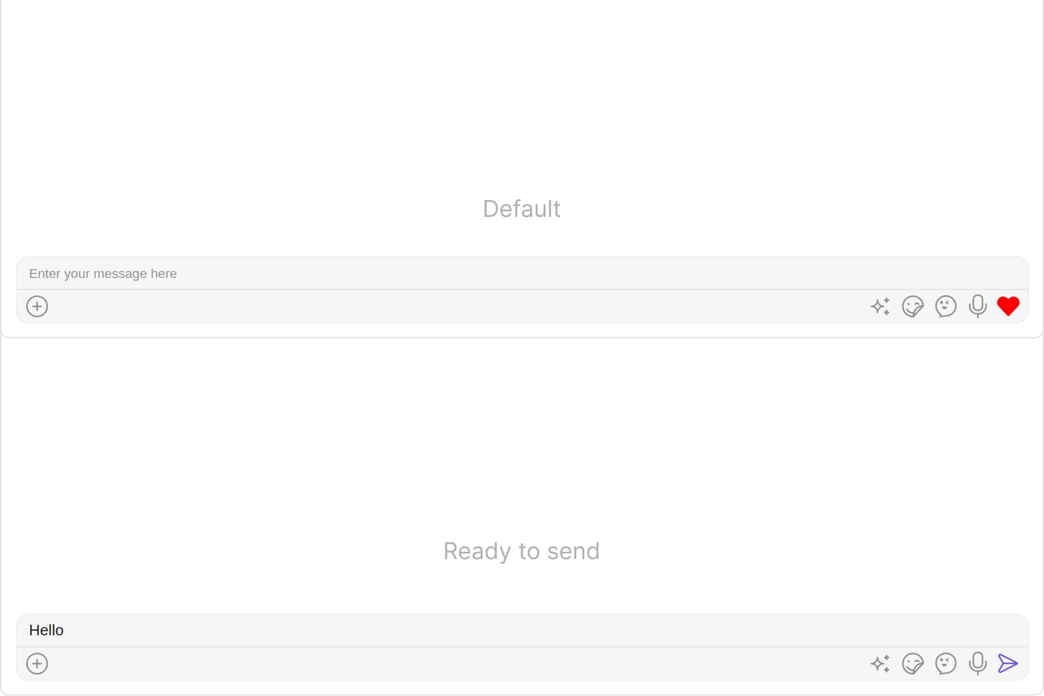These are a set of small functional customizations that allow you to fine-tune the overall experience of the component. With these, you can change text, set custom icons, and toggle the visibility of UI elements.- MessageComposerDemo.tsx